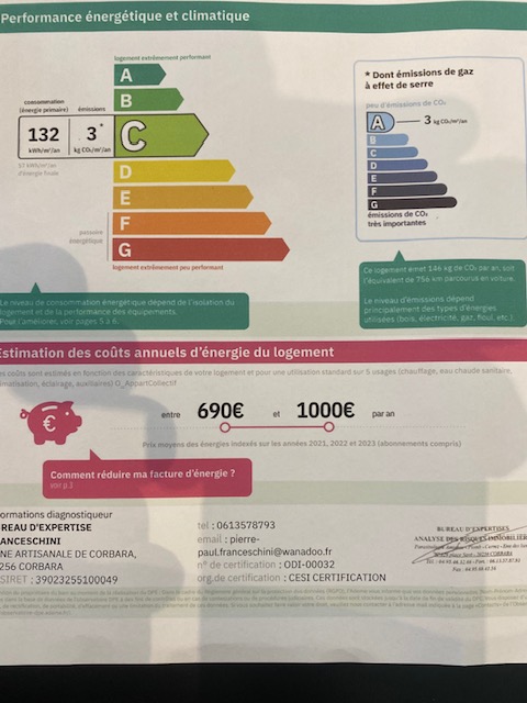 Dpe /C 3/132 et GES A 3 avec une consommation entre 690 EUROS et 1000 euros par an